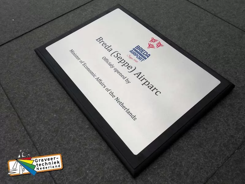 Op de voorzijde een aluminium A4 formaat (210x297mm) bedrukte plaat met uw opdruk.