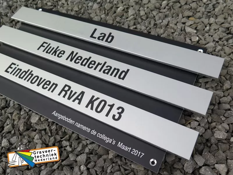 Plaquette 450x220mm (of andere afmeting) zwarte achterplaat met bv 3 naar voren stekende blank aluminium stroken met uw tekst.