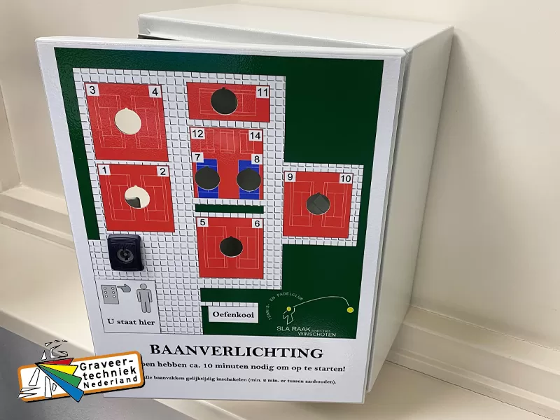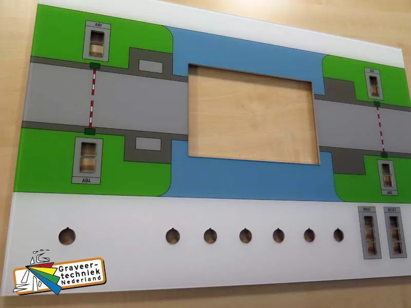 Kunststof brugpaneel (excl kast) uit verschillende kleuren opgebouwd, voorzien van gaten, belijning en tekst.