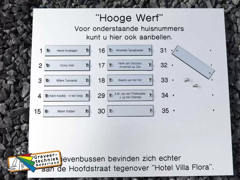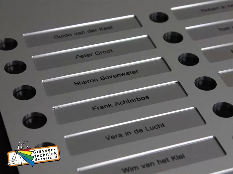 Met kunststof naamplaatjes welke te verwisselen zijn.