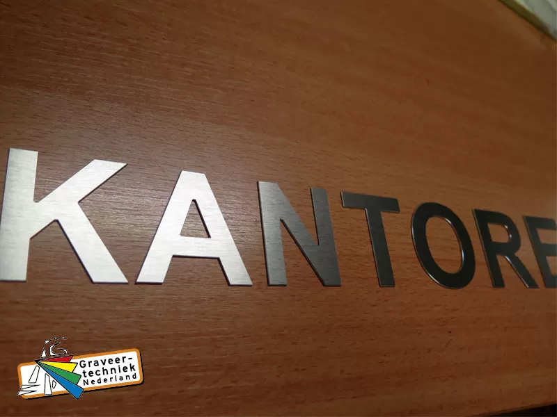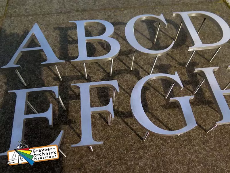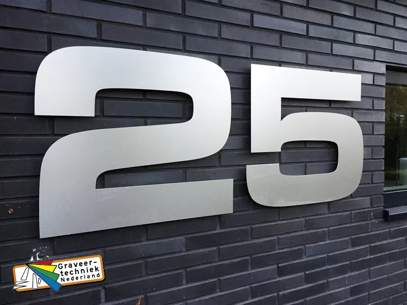 In dit geval losse letters 60mm hoog, uit 1mm aluminium met een rvs kleur voor bv op de deur, ook ander lettertype of letterhoogte mogelijk.