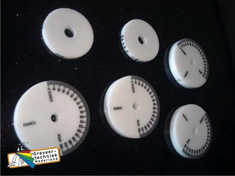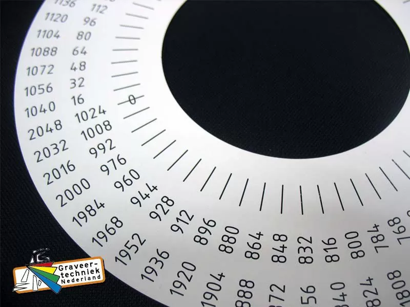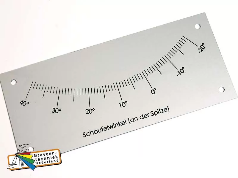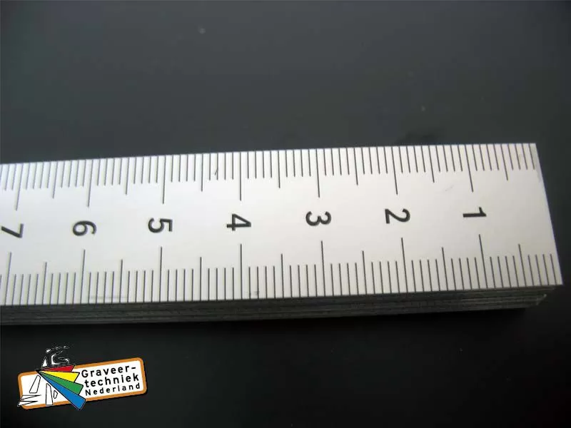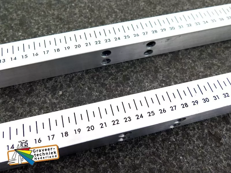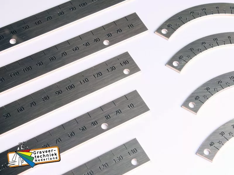 Hieronder voorbeelden van het graveren van linialen, schaalverdelingen, gradenbogen, of een nonius.Graveren van een liniaal in cm of inches in het rond of recht, mogelijk in diverse materialen.