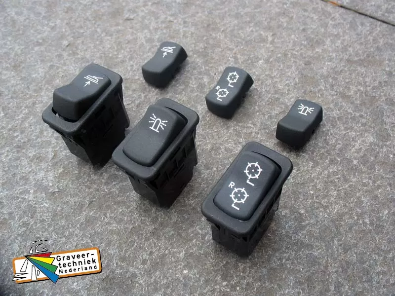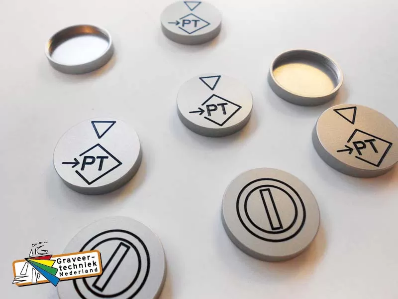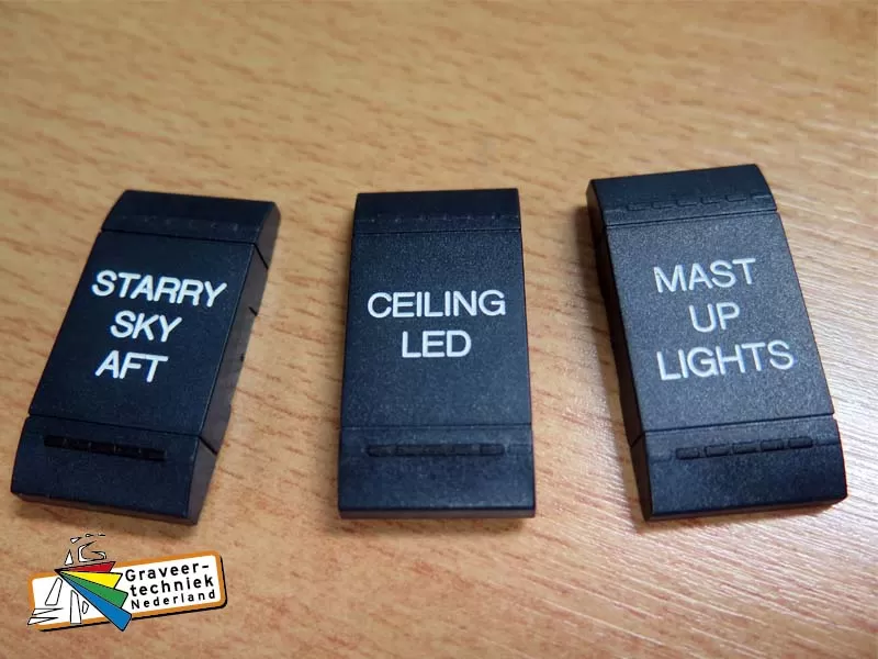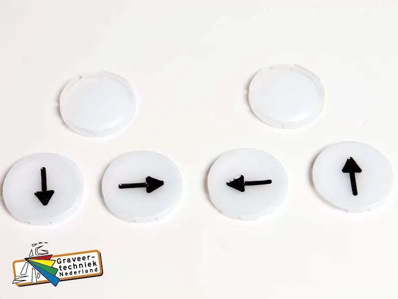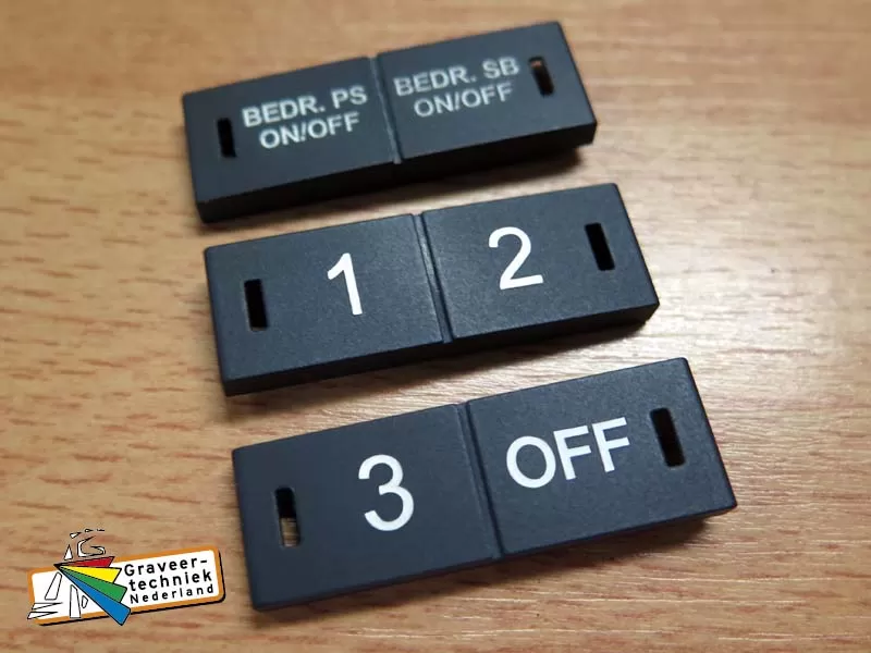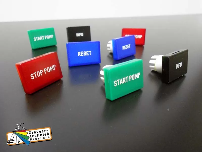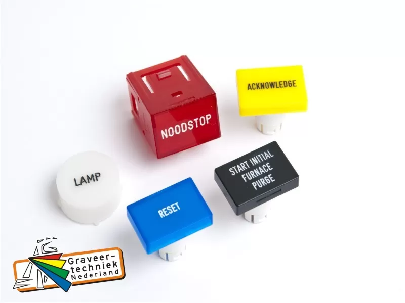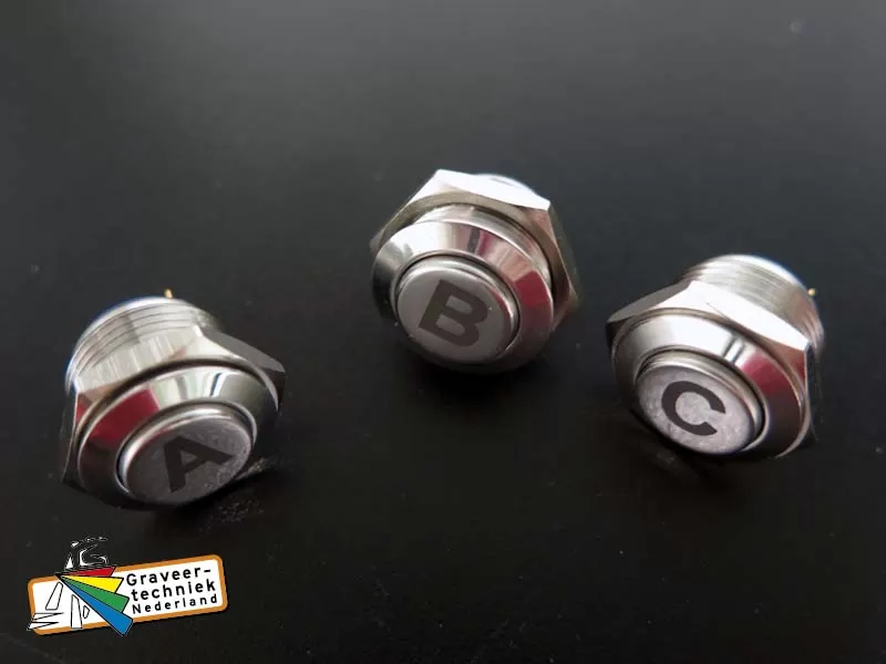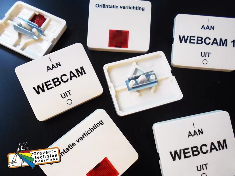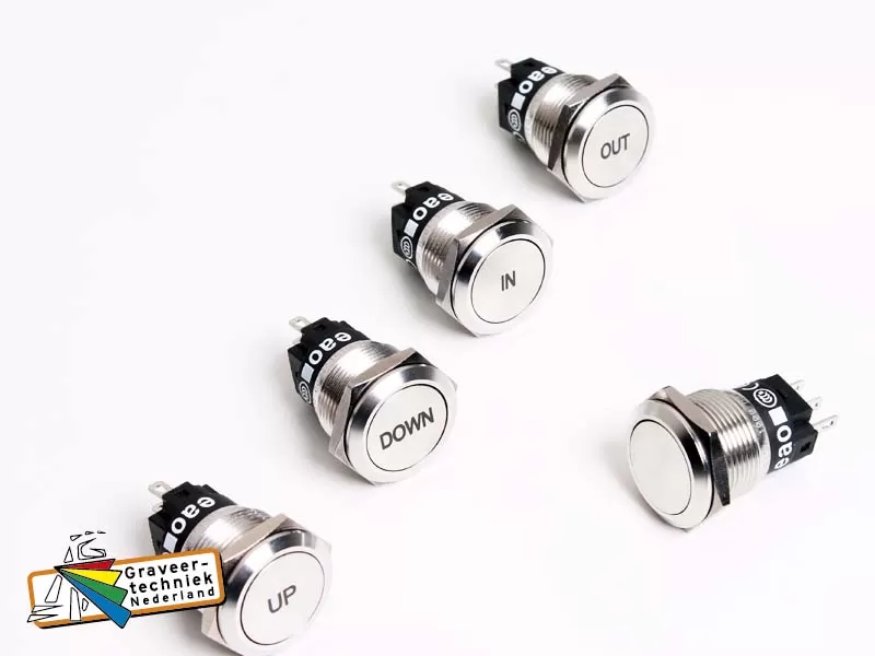 U levert de lens, drukknop of schakelaar aan, wij graveren de tekst erin.