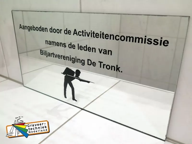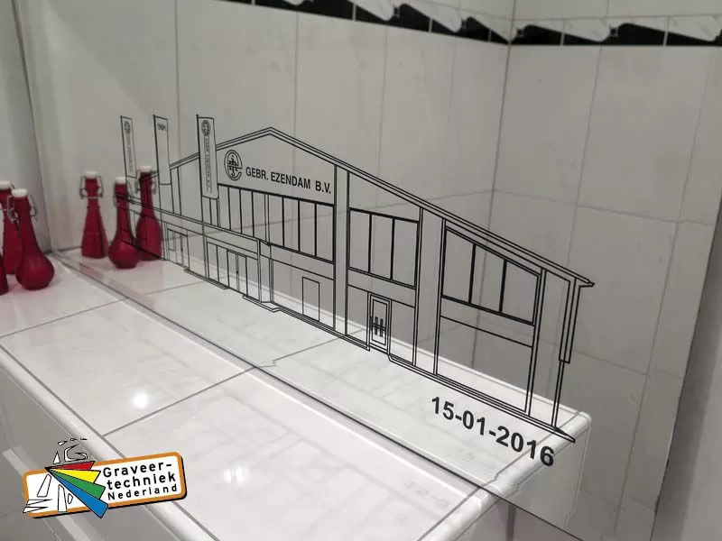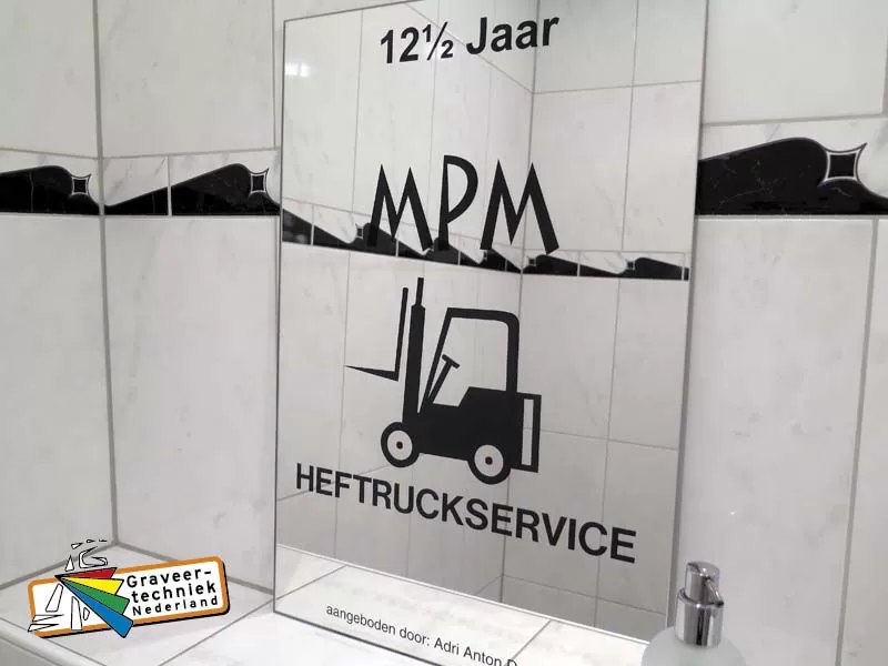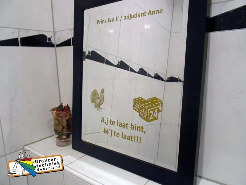 Door klant aan te leveren spiegel voorzien van gravure opdruk aan de achterzijde.